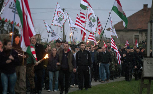 Jobbik supporters take part in an anti-Roma march in Hejoszalonta, Hungary.