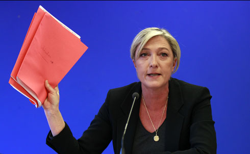 Marine Le Pen at a news conference in December 2010 during which defended her remarks comparing overflowing Mosques in France to the Nazi occupation.