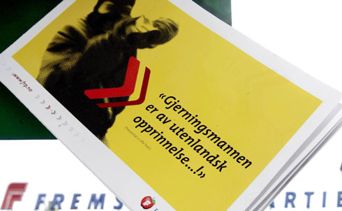 A brochure for the Progress Party urges tighter limits on immigration depicts a masked criminal with the text, “The man is of foreign origin.”