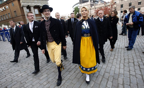 Sweden Democrats head Jimmie Akesson, left, in a traditional costume.