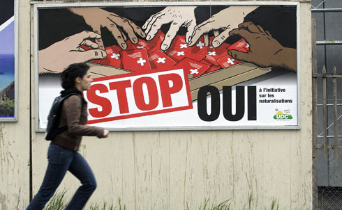 A Swiss People’s Party campaign poster, showing hands taking Swiss passports.