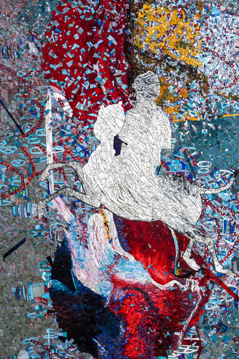 SS: The resulting collaboration, a series of four etchings titled Portrait of the Artist and Breath of Miraj, provides a lyrical interpretation of the Prophet’s celestial ascent. For me, this work was rather uncanny in its timing: I won the Princeton commission around that moment and also started researching several historical miraj paintings with the art historian John Seyller such as the Ilkhanid paintings held in the Topkapı Palace Library in Istanbul, the Timurid miraj paintings in the David Collection in Copenhagen, and the ascension painting attributed to Sultan Muhammad from Khamsa of Nizami, Tabriz Iran, in the British Library. The more I studied the various historical miraj paintings, the more I connected I felt to the visual, stylistic, and emotional intelligence of the works. It was a deeply moving experience. Then I had the epiphany to incorporate the ascension motif in the Princeton mosaic, with the hope to inject a visceral and powerful experience for the viewer.