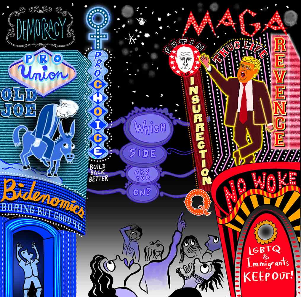 Twenty-three-year-old James Cain, who attended the University of Nevada at Las Vegas before dropping out, can see the appeal. Cain is disillusioned with politics in general and, even though he thinks Trump is “garbage,” is considering voting for him in 2024, simply because he says things that make Cain and his friends laugh. He is cynical enough to believe that many politicians are only in it for themselves, and like so many Americans today, he is deeply suspicious of any politician’s ability to change a status quo that, with high student-loan debt, unaffordable housing, and several years of a pandemic followed by inflation and rising interest rates, isn’t working for him and his friends. And so, he intends to vote for the clown. Cain regards the revenge-obsessed ex-president as more of a loud-mouthed cable TV comedian or a YouTube influencer than a deadly serious demagogue.