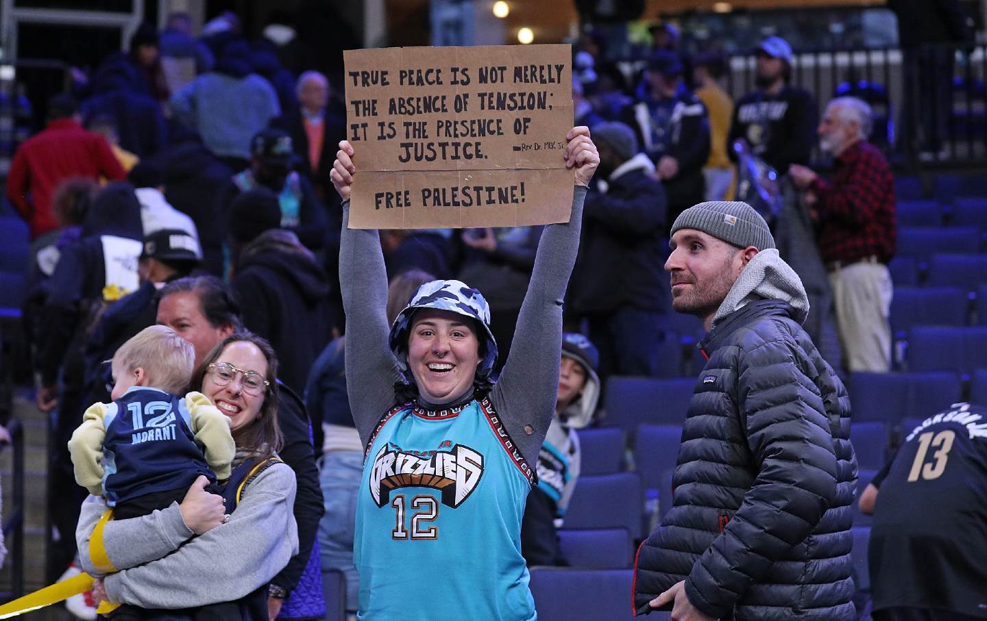 A fan holds up a pro-Palestine sign during a January 15 game between the Memphis Grizzlies and the Golden State Warriors.
