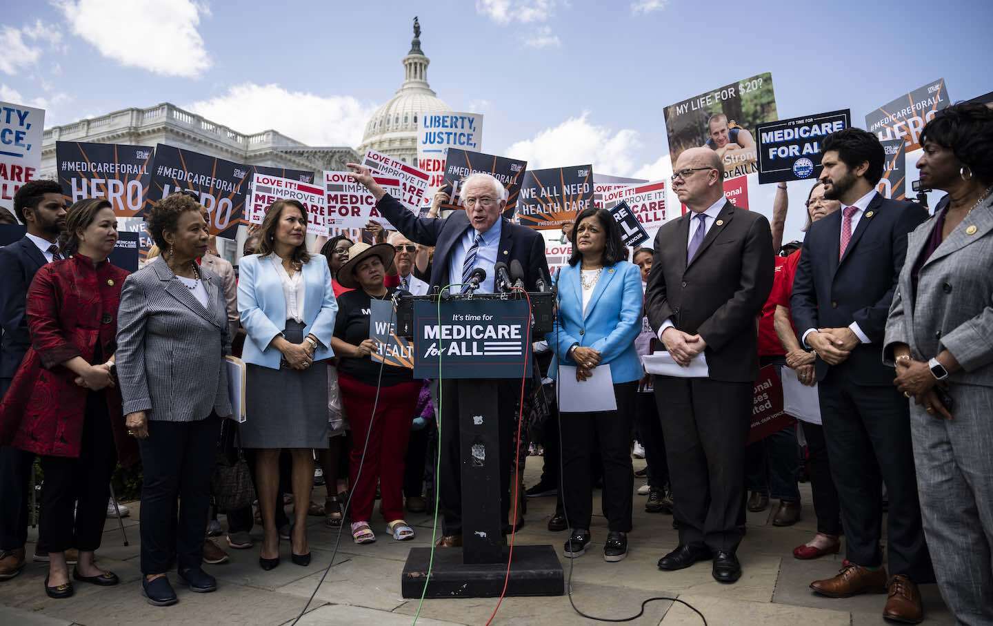 Senator Bernie Sanders (I-VT) speaks during a news conference with House Democrats to announce the reintroduction of the Medicare for All Act, outside the US Capitol on May 17, 2023, in Washington, DC.