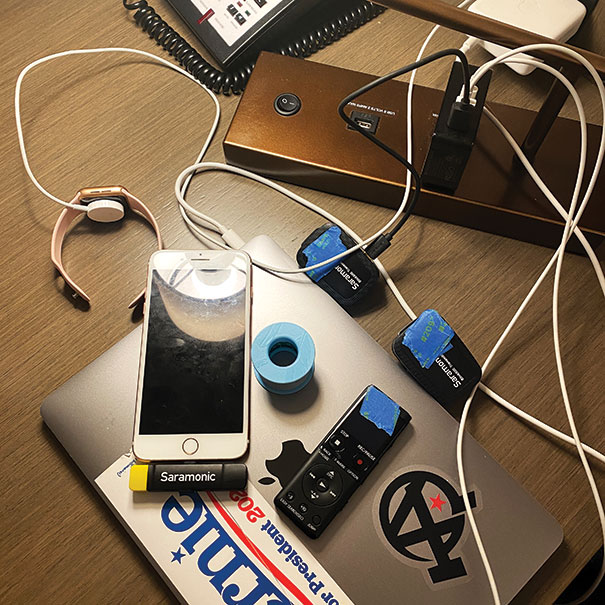 In the movies, spies have tiny audio recorders that perfectly capture sound, but the real-life options aren’t so glamorous. I ended up with a bulky Bluetooth microphone set that used my old iPhone as the receiver. I kept the iPhone in my purse, stuck blue painter’s tape over the microphone’s indicator lights, and blackened the tape with a Sharpie. If I wore a push-up bra and an opaque top, I could easily hide the microphone between my boobs.