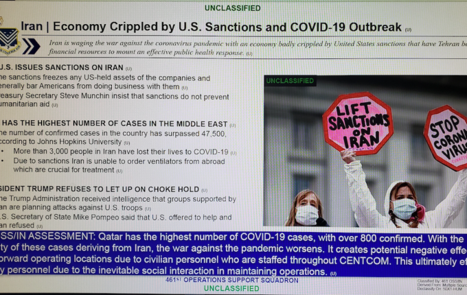 US sanctions on Iran have “badly crippled” its economy as well as its ability to respond to the coronavirus pandemic, which endangers nearby US troops, according to a military intelligence brief obtained by The Nation.