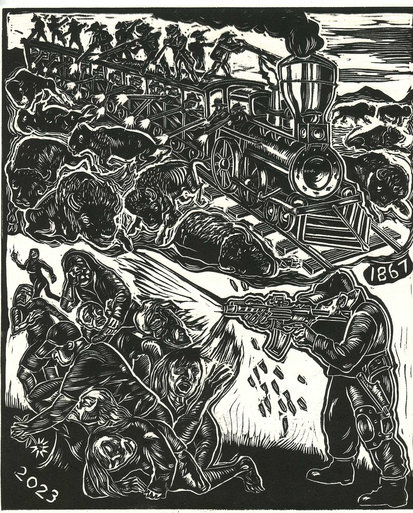ActivismOppArtSeptember 5, 2023The American History of Gun ViolenceThe American History of Gun ViolenceRacism drives that train. Sue Coe Share Copy Link Facebook X (Twitter) Bluesky Pocket Email September 5, 2023 Check out all installments in the OppArt series.