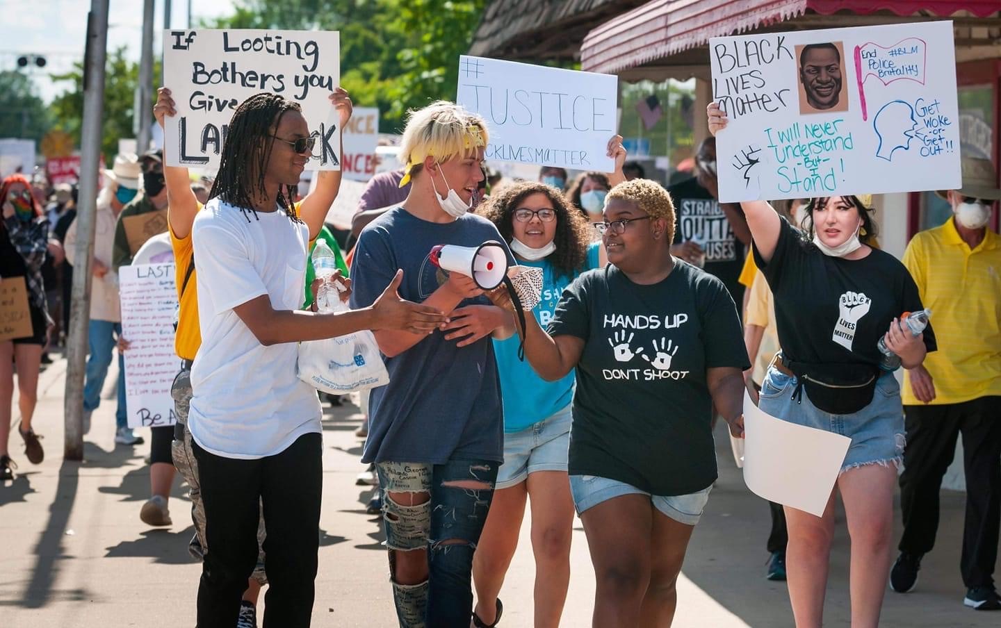Many demonstrations have been led by teens, college students, and first-time activists. On a hot evening in early June a thousand people followed five teenagers down Main Street in Ada, Okla. For two of the teens, Is’Abella Miller and Delanie Seals, the video of Floyd’s killing was horribly familiar: One of their relatives died last fall during an encounter with an Ada police officer that was filmed by a bystander. “Anthony was our unknown George,” said Seals, 18, referring to her cousin Anthony Meely. “It really hit home for us.” Both recall being the target of racist comments in school, and said they received threats as they organized the march. “A lot of people say racism doesn’t happen here, but it does, just like any place,” said Seals.