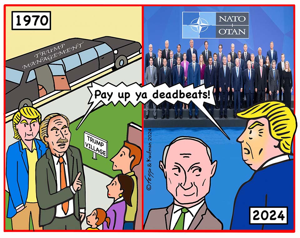 In line with his father’s ruthless landlord legacy, Trump challenges NATO members who fail to pay their “dues.”