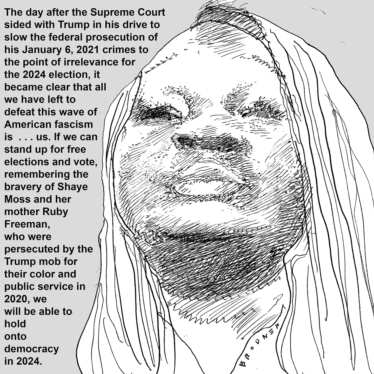 Steve Brodner is an award-winning graphic artist/journalist and the winner of the 2024 Herb Block Prize for editorial cartooning.