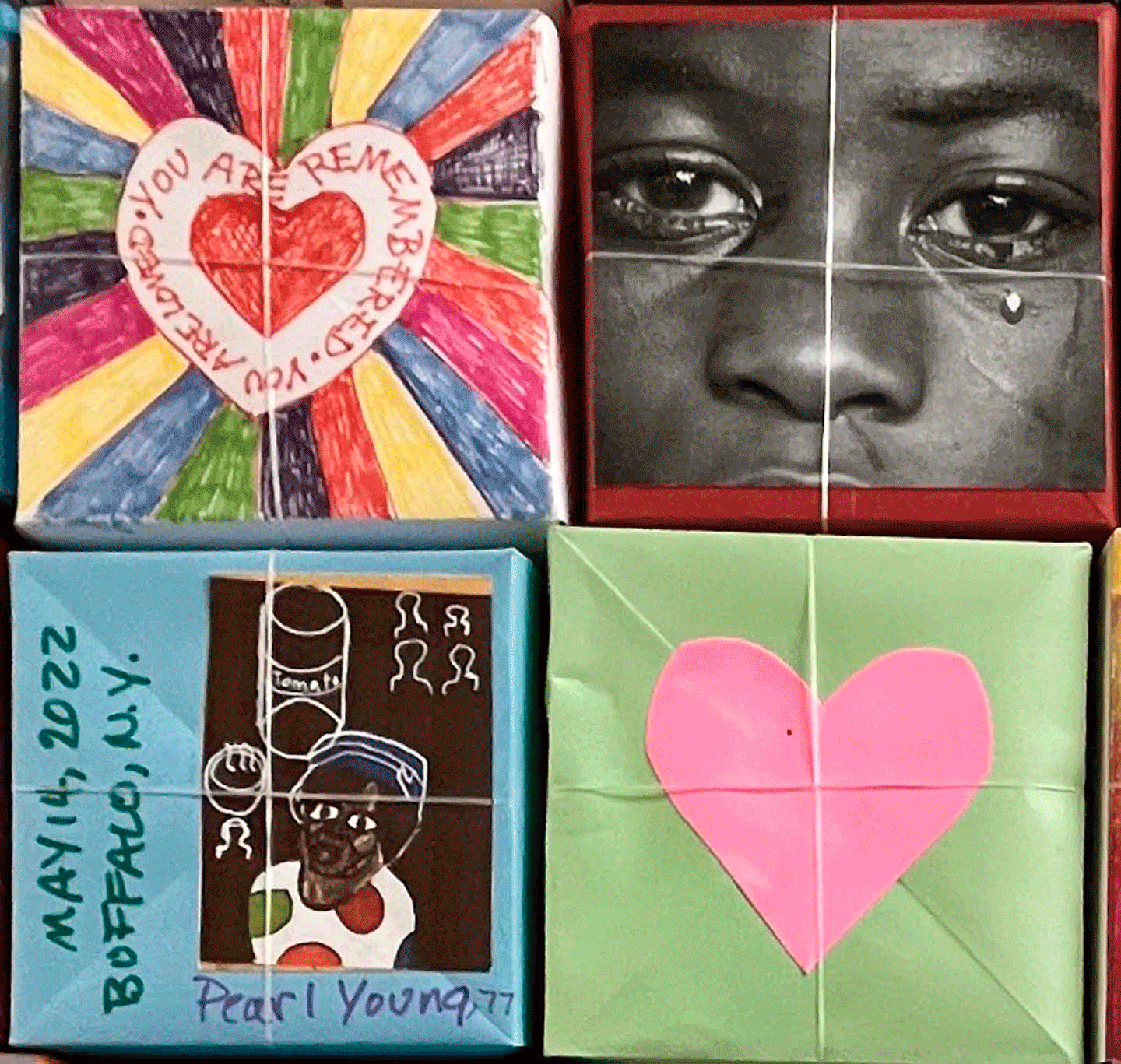 A student-created art installation at Riverdale Country School, Bronx, NY, by PICA, led by artist-educa-tor Nicky Enright, in collaboration with the Soul Box Project, a national initiative founded by artist Leslie Lee.