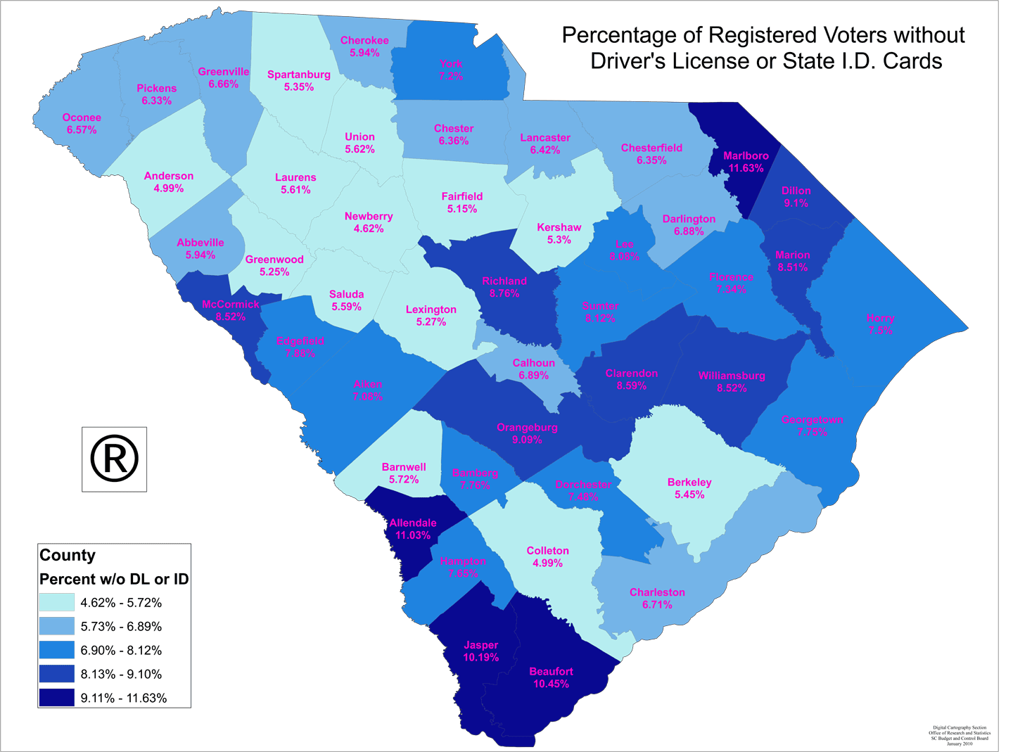 “Notably, seven counties with the highest percentages of registered voters who lack DMV-issued identification are also among the ten counties in South Carolina that have the highest percentage of voting-age persons who are non-white,” according to the Department of Justice.