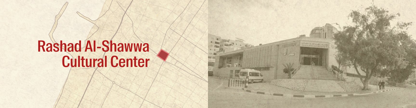 Founded in 1985 as Palestine’s first cultural center, the Rashad Al-Shawa Cultural Center was intended to break Gaza’s cultural isolation. It hosted exhibitions, performances, and educational programs, cultivating artistic expression among all sectors of the Strip. Palestinian and Arab artists performed on its stage, bringing plays, concerts, film screenings, and other events to the people of Gaza. Among its most prominent figures was Leila Shawa, who designed the stained-glass panels in the main hall. Local Gazan artists, such as Maisara Baroud and Raed Issa, were regular exhibitors, central to the site’s cultural blossoming. Even the building was a work of art; designed by architect Saad Mahfel, it was once shortlisted for the Aga Khan Award for Architecture for its integration of art and local identity. At its center was the Diana Tamari Sabagh Library, one of the largest halls in the Strip, where thousands of books cradled knowledge gathered across diverse fields.