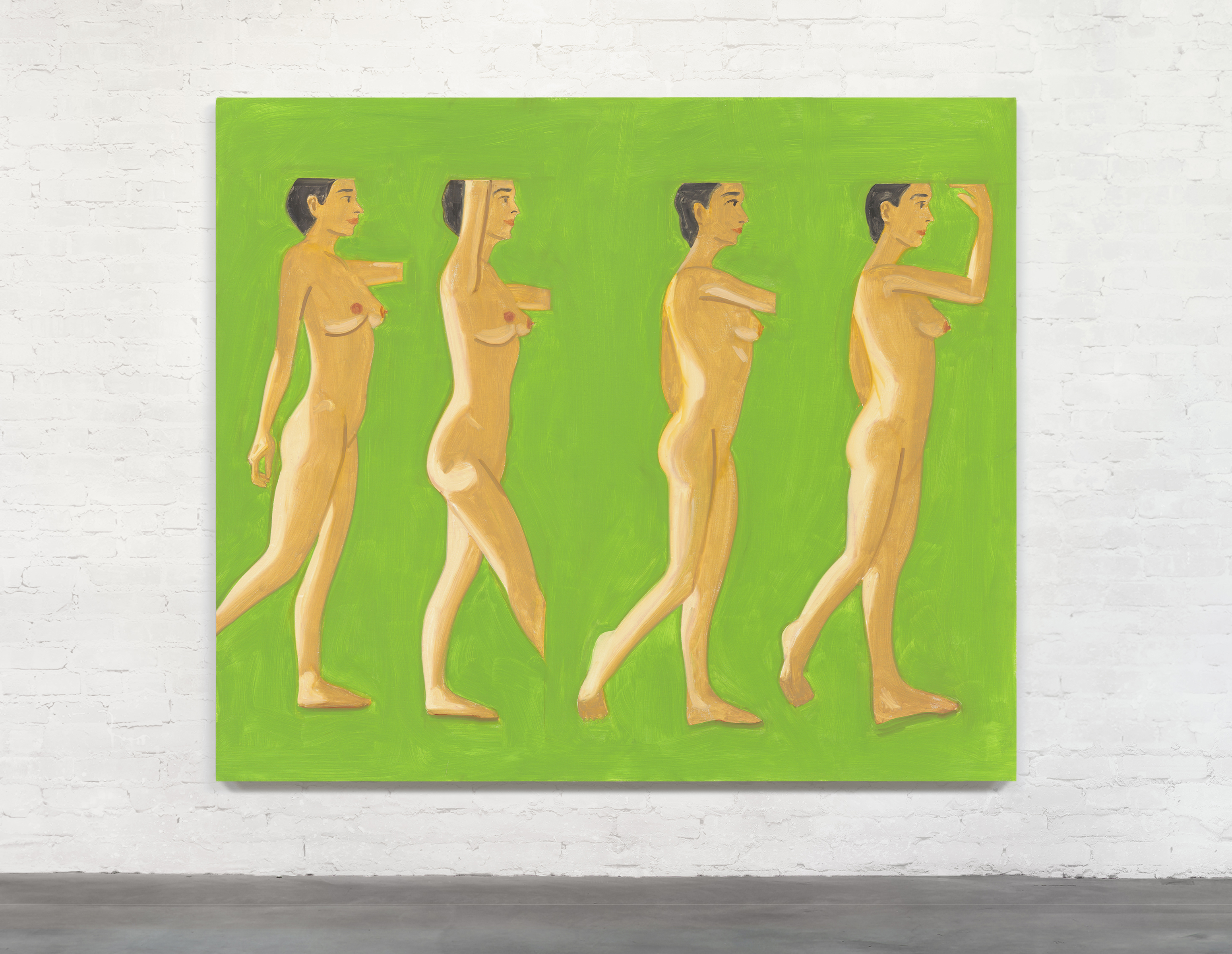 Reflected in these sculptures’ gleaming surfaces were the series of paintings installed around them on the gallery’s ground floor, all from a 2018 series titled “Homage to Degas”—more dancers. The nude figures have all been painted against a harsh almost lime bordering on neon green background. I kept thinking that the artist must have wanted to challenge himself, to see if he could give force to his figures by placing them in a chromatic environment that would be as inhospitable as possible to the color of their skin (the dancers are all white women). Each painting shows the same figure in two or more views. As with the sculptures, the figures can be strangely cropped, and not necessarily by the edge of the canvas but simply by some invisible guillotine line within the composition, which sometimes gives the impression that one is seeing a diptych or polyptych—which none of these paintings are. Or you might think momentarily of Eadweard Muybridge’s late-19th-century studies of animal locomotion, except that none of Katz’s paintings show a single continuous movement. Instead, the iterations of the figure tend to bump up against each other with an abruptness that is only faintly cushioned by any intervening strip of radioactive green background.
