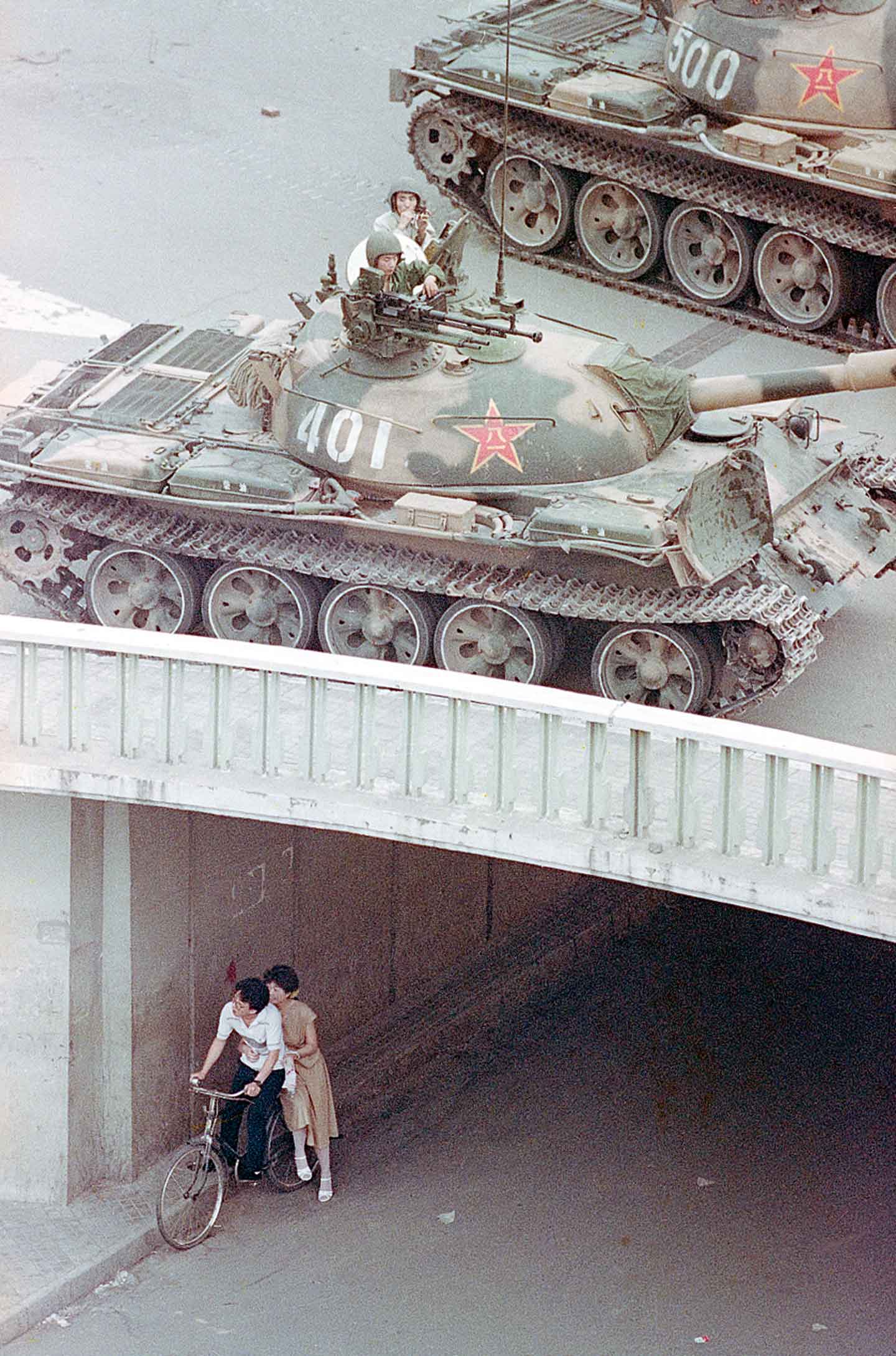 “Despite the menacing tank treads, no one fled. The tanks lost this first battle of willpower and courage. The first tank screeched to a halt ‘so suddenly that the streets shuddered, and the top half of the tank lurched forward.’ Eventually, the tanks fired tear-gas bombs at the crowds to disperse them. They then mowed down the protesters who were fleeing the choking yellow smoke, and killed at least a dozen people on the spot. Five young protesters were killed at the southwest corner of Liubuko Junction. Two of them were crushed onto bicycles, their corpses mangled together with the bikes.”