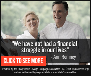 Ann Romney made a noteworthy admission in the same interview, and the Progressive Change Committee is launching a targeted online ad campaign in Ohio to make sure voters there see it. Ann said, “Mitt and I do recognize that we have not had a financial struggle in our lives.” This is a classic “Kinsley gaffe,” defined as a when a politician accidentally tells the truth. Of course, the Romneys—who grew up wealthy and became far wealthier—have not had a financial struggle.