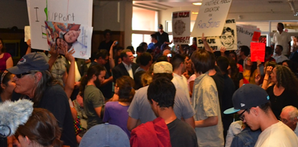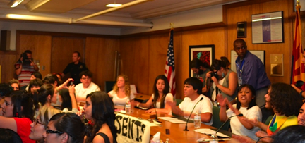 While hundreds of supporters packed the district meeting room in a celebratory fashion, nine MAS students and UNIDOS activists defied security officers and literally took over the board members’ places minutes before the meeting was scheduled to begin.