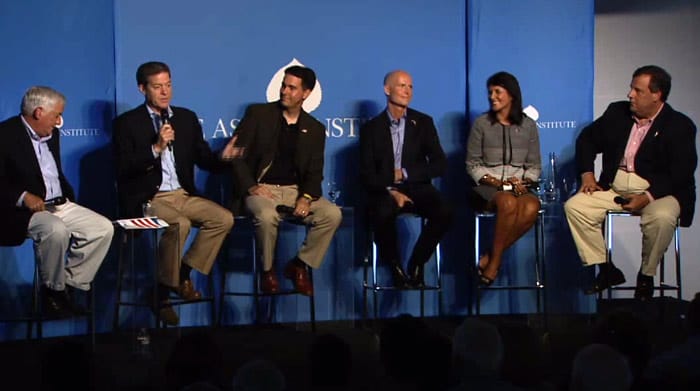 You never know what might happen when a bunch of Republican governors get together to discuss policy and politics. Well, actually you do kinda know: that they’ll make asses out of themselves, and at great length. So it was with some trepidation and some glee that your faithful Christie Watchers took a look at the discussion at the Aspen Institute bringing together five GOP governors: Chris Christie of New Jersey, Rick Scott of Florida, Nikki Haley of South Carolina, Scott Walker of Wisconsin and Sam Brownback of Kansas. Two of them, Christie and Walker, are potential GOP candidates in 2016, and Haley might be positioning herself as a vice presidential candidate.