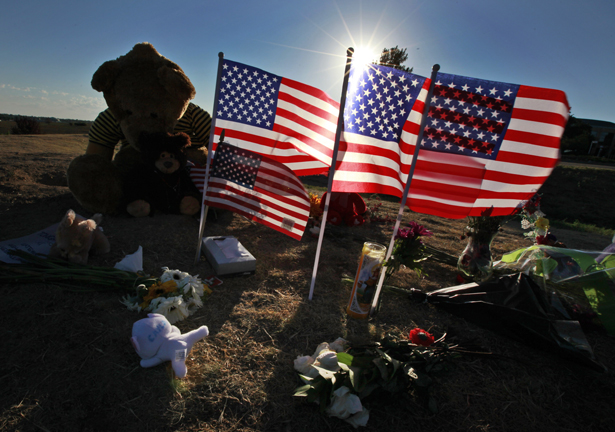 The sun rises between flags placed at a memorial near the the Century 16 movie theater Sunday, July 22, 2012, in Aurora, Colorado. (AP Photo/Alex Brandon)