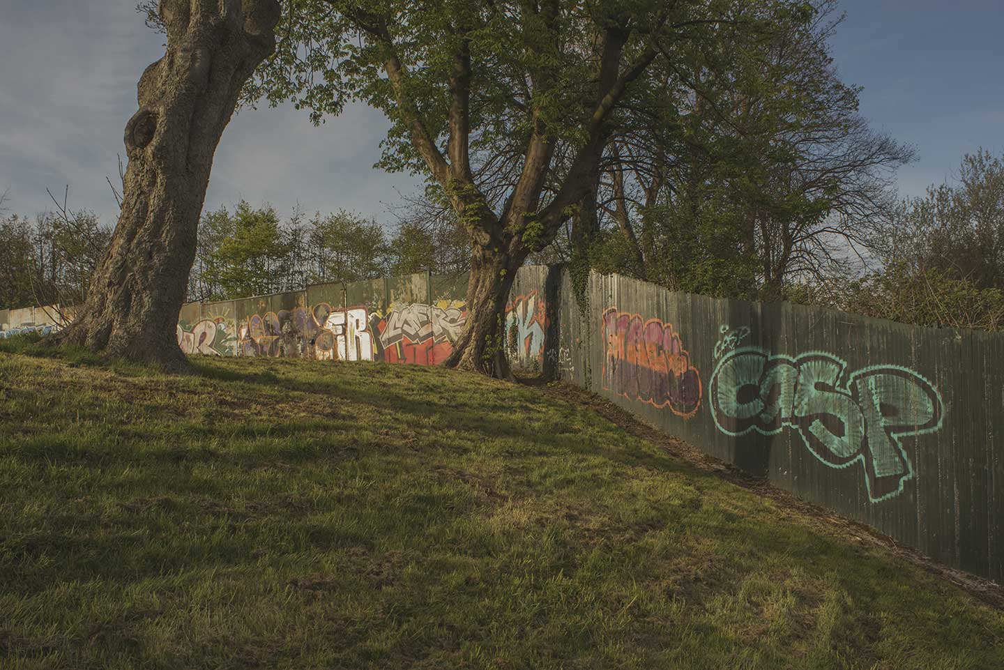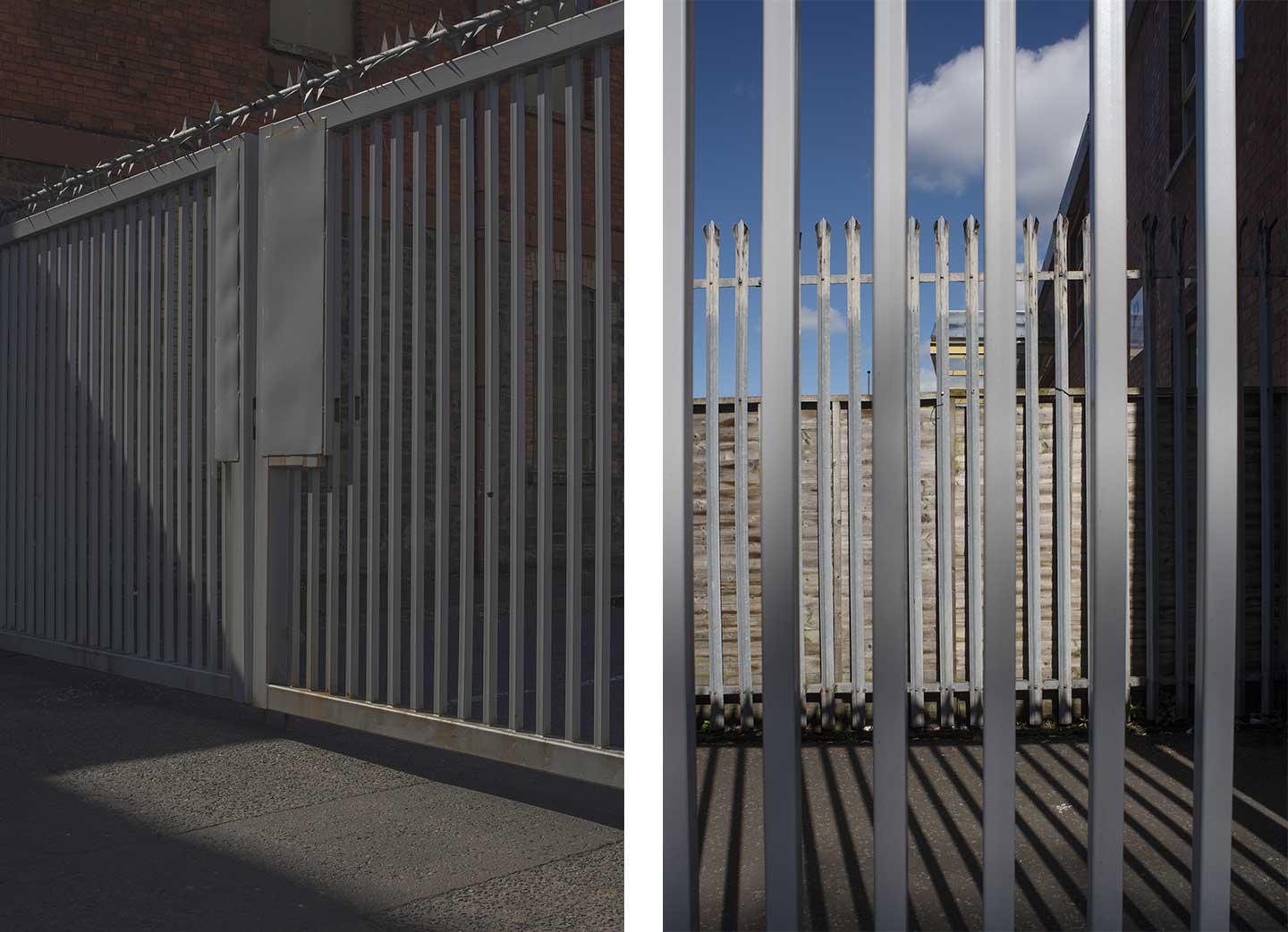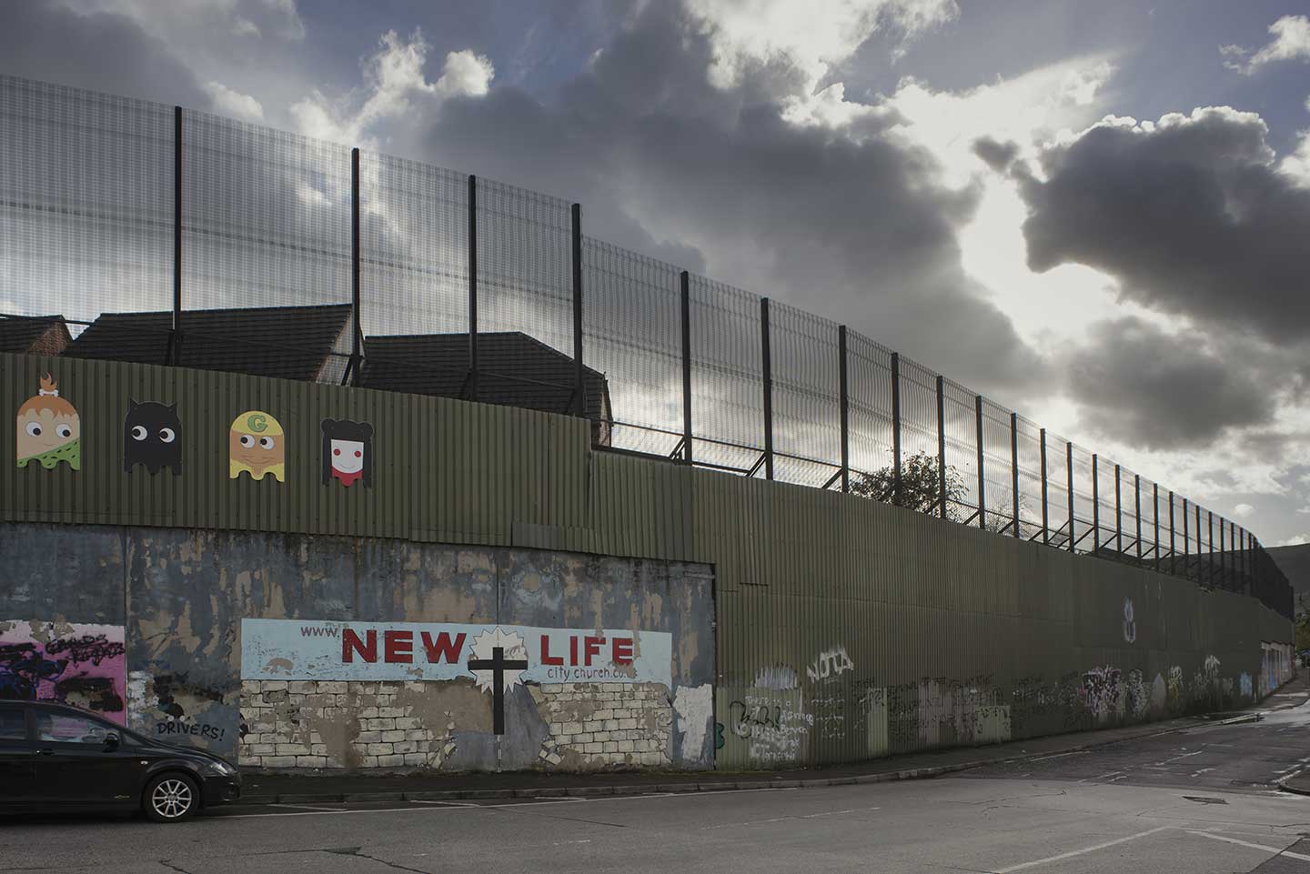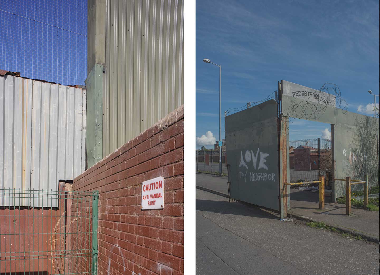 During the height of the Troubles, the Northern Ireland Department of Justice took over land to create physical obstacles in an effort to quell the violence, Department of Justice official John Chittick told us. What was presented as a quick, temporary solution soon became part of the fabric of Belfast. To this day, the segregation between Catholic and Protestant is manifested in concrete, brick, corrugated metal, and chain-link fencing. The walls, euphemistically known as “peace lines,” contribute to the harshness of the city. The opening and closing of heavy gates keep the rhythm of the day, and the interface areas, neighborhoods cut through by these walls, are where much of the violence occurred.