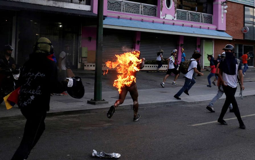 The other day, anti-government protesters in Venezuela set a man on fire, severely burning nearly 80 percent of his body. The man had brown skin, and government supporters say he was a Chavista, to highlight the racist savagery of their adversaries. The opposition says he was a thief.