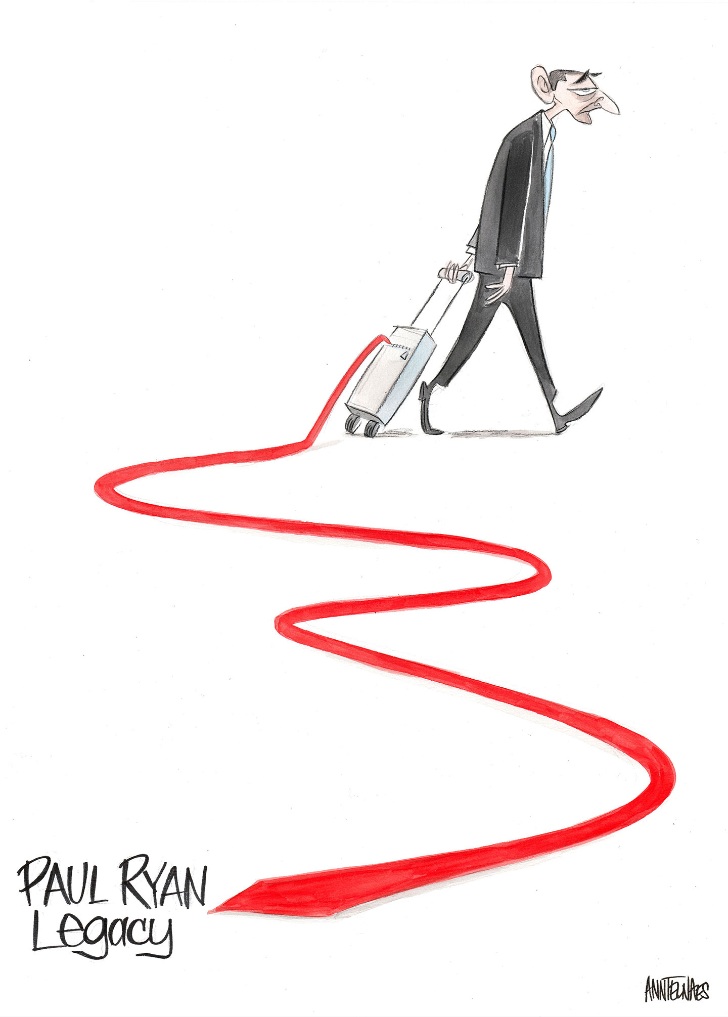 PoliticsOppArtJanuary 4, 2019Bye-bye, RyanBye-bye, RyanLeaving a trail of Trumpesque damage. Ann Telnaes Share Copy Link Facebook X (Twitter) Bluesky Pocket Email January 4, 2019 Check out all installments in the OppArt series.