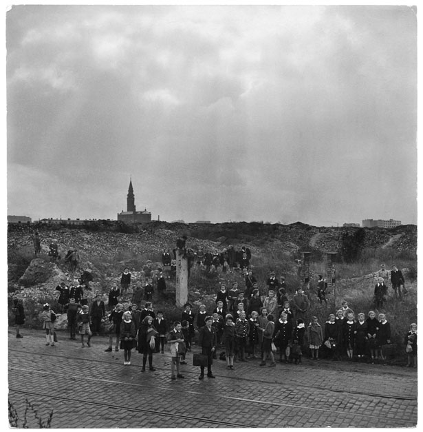 [Schoolchildren waiting for a bus in the ruins of the destroyed ghetto, Warsaw], 1948. © David Seymour/Magnum Photos