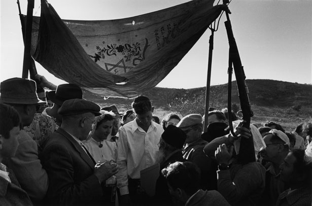 [Wedding under an improvised huppah, propped up with guns and pitchforks, Israel], 1952. © David Seymour/Magnum Photos