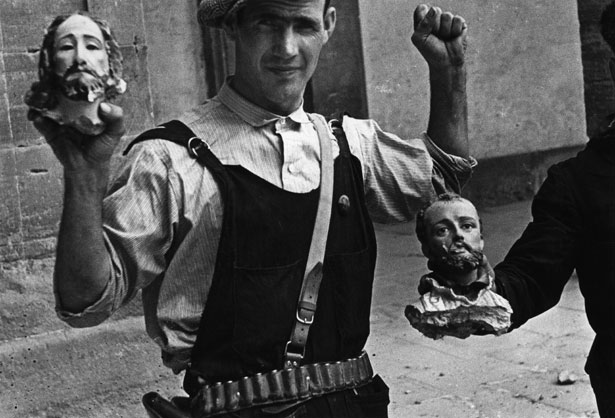 A Republican militia man poses for the photographer in front of an already ransacked church, Barcelona, July 1936. © David Seymour/Magnum Photos