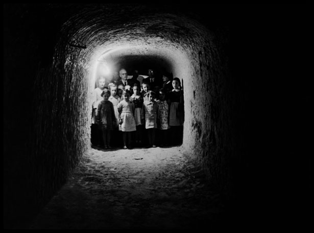 It’s a strange photograph, something like a class portrait from a school under siege. In it, the pitted walls of an air raid shelter frame a dozen or so children and their caretakers behind them, peering out of the darkness. A naked light bulb casts a dim glow over the students as they stare at the photographer, hands resting at their sides. Their gaze draws the viewer into and down the shelter’s length. Do their faces betray fear, or a wary concern over the disruption of their daily routine?