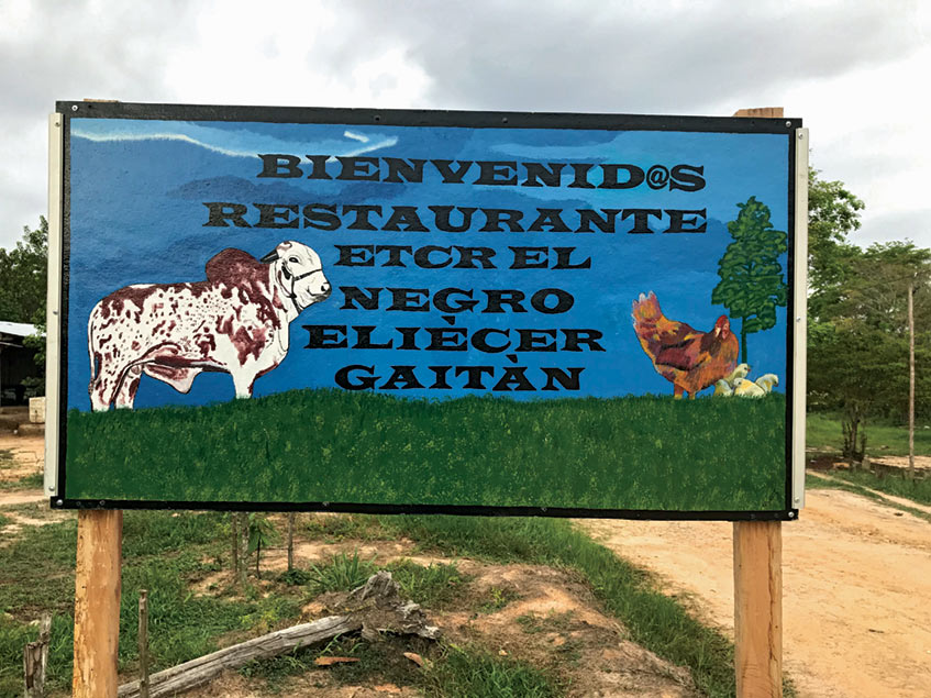 When the disarmed FARC members arrived at Caño Indio, they decided to name their ETCR after a fallen comrade. They voted to commemorate a much-loved comandante who had recently been killed in an ambush along with his companion while the peace accord was in its final stages of approval. His nom de guerre, El Negro Eliécer Gaitán, is memorialized in a painted sign across from the restaurant.