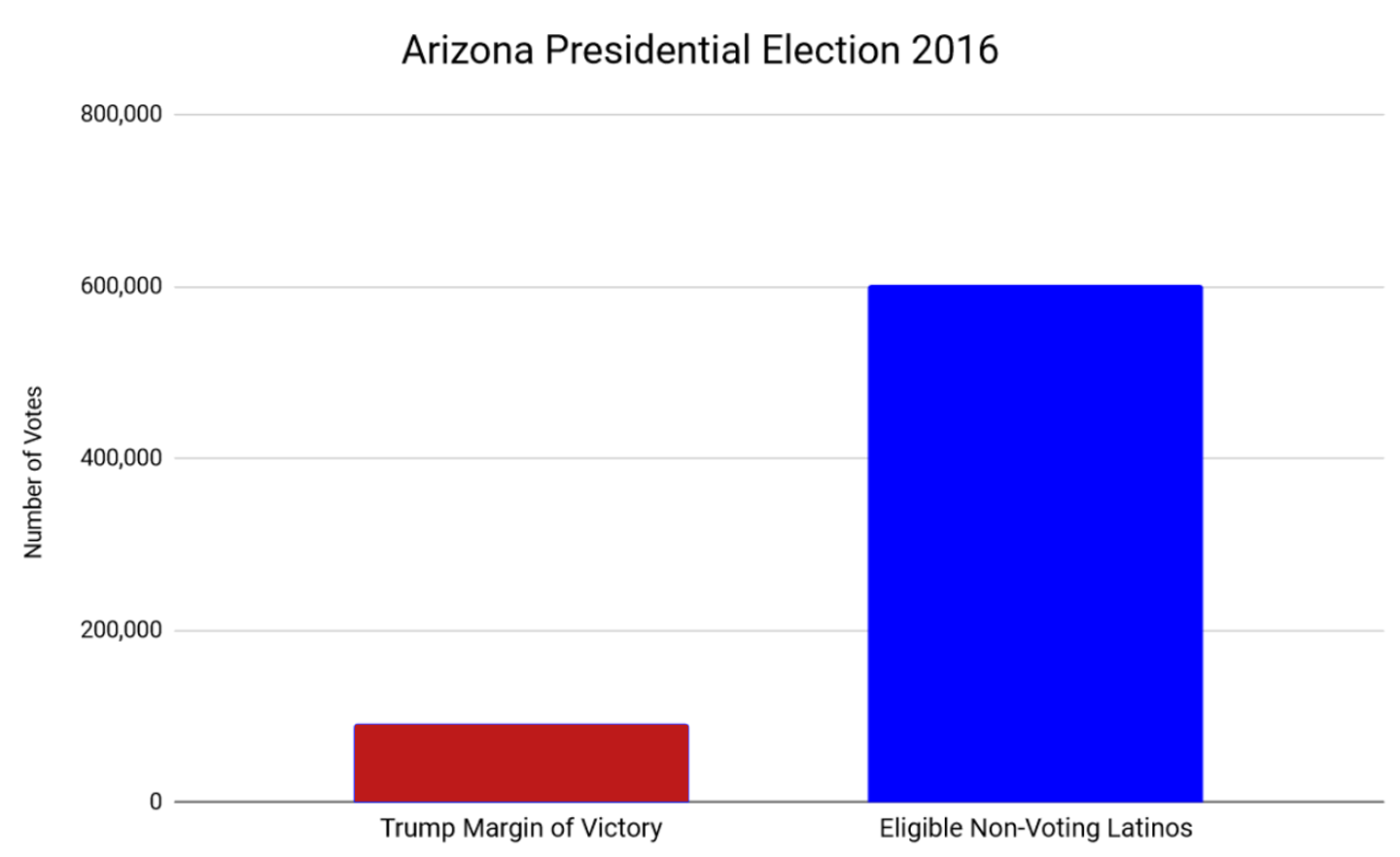Often overlooked in 2016 election postmortems is the fact that Arizona was one of the most closely contested states in the country. Clinton lost by just 3.5 percent—coming closer than she did in Ohio, Iowa, and North Carolina, states that slid from the Democratic column after Obama had previously won them. Trump won by just 91,000 votes in Arizona, a state in which 600,000 Latinos who were eligible to vote didn’t cast ballots.