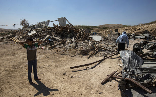 A Bedouin man and his son walk among the rubble of their family’s home which was demolished by Israeli authorities. (Reuters/Ronen Zvulun)