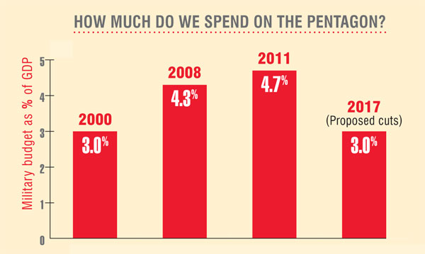 The graph below provides some perspective on these figures. As we see, last year’s $700 billion military budget represented 4.7 percent of the country’s GDP. This was higher even than in 2008, Bush’s last year in office, when defense was 4.3 percent of GDP. In 2000, Bill Clinton’s final year in office and before the 9/11 terrorist attacks, military spending was 3 percent of GDP. In today’s economy, the difference between a military budget at 3 percent of GDP versus 4.7 percent is $260 billion. Thus, if we were to return just to the 2000 level of defense spending as a share of the economy, that would itself entail “budget cuts” of about $1 trillion over four years (i.e., $260 billion per year for four years).