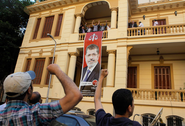 Egyptian supporters of the Muslim Brotherhood’s candidate, Mohamed Morsi, celebrate next to a giant poster of him at his campaign headquarters in Cairo, Egypt, Sunday, June 24, 2012. Mohammed Morsi was declared Egypt’s first Islamist president on Sunday after the freest elections in the country’s history, narrowly defeating Hosni Mubarak’s last Prime Minister Ahmed Shafiq in a race that raised political tensions in Egypt to a fever pitch. (AP Photo/Amr Nabil)