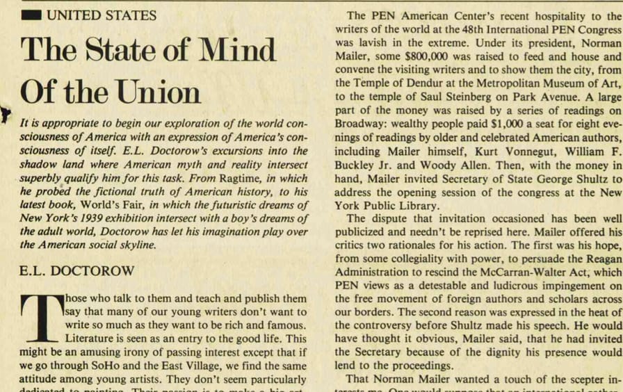 Doctorow perceived a long-term, substantive trend at work that threatened to undermine the people’s text: “We are evolving under Realpolitik circumstances into a national military state—with a militarized economy larger than, and growing at the expense of, a consumer economy: a militarized scientific-intellectual establishment; and a bureaucracy of secret paramilitary intelligence agencies—that becomes increasingly self-governing and unregulated.” One of Doctorow’s recurring themes is the sovereign role in American culture of the atomic bomb, an enduring legacy of World War II. As he wrote in “The State of Mind of the Union” (March 22, 1986), “The great golem we have made against our enemies is our culture, our bomb culture—its logic, its faith, its vision.”