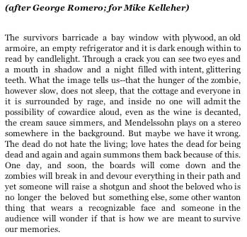 (after George Romero; for Mike Kelleher)The survivors barricade a bay window with plywood, an old armoire, an empty refrigerator and it is dark enough within to read by candlelight. Through a crack you can see two eyes and a mouth in shadow and a night filled with intent, glittering teeth. What the image tells us–that the hunger of the zombie, however slow, does not sleep, that the cottage and everyone in it is surrounded by rage, and inside no one will admit the possibility of cowardice aloud, even as the wine is decanted, the cream sauce simmers, and Mendelssohn plays on a stereo somewhere in the background. But maybe we have it wrong. The dead do not hate the living; love hates the dead for being dead and again and again summons them back because of this. One day, and soon, the boards will come down and the zombies will break in and devour everything in their path and yet someone will raise a shotgun and shoot the beloved who is no longer the beloved but something else, some other wanton thing that wears a recognizable face and someone in the audience will wonder if that is how we are meant to survive our memories. |