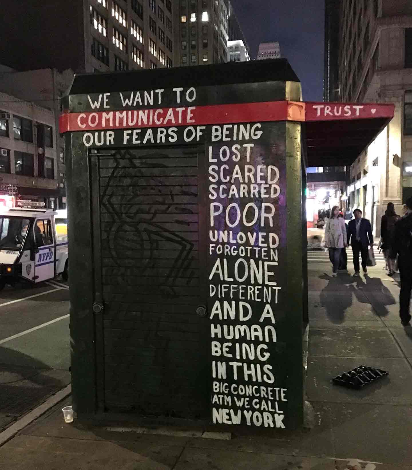 ActivismOppArtAugust 2, 2018From the Streets of NYCFrom the Streets of NYCMessage for the passerby. Anonymous Share Copy Link Facebook X (Twitter) Bluesky Pocket Email August 2, 2018 Check out all installments in the OppArt series.