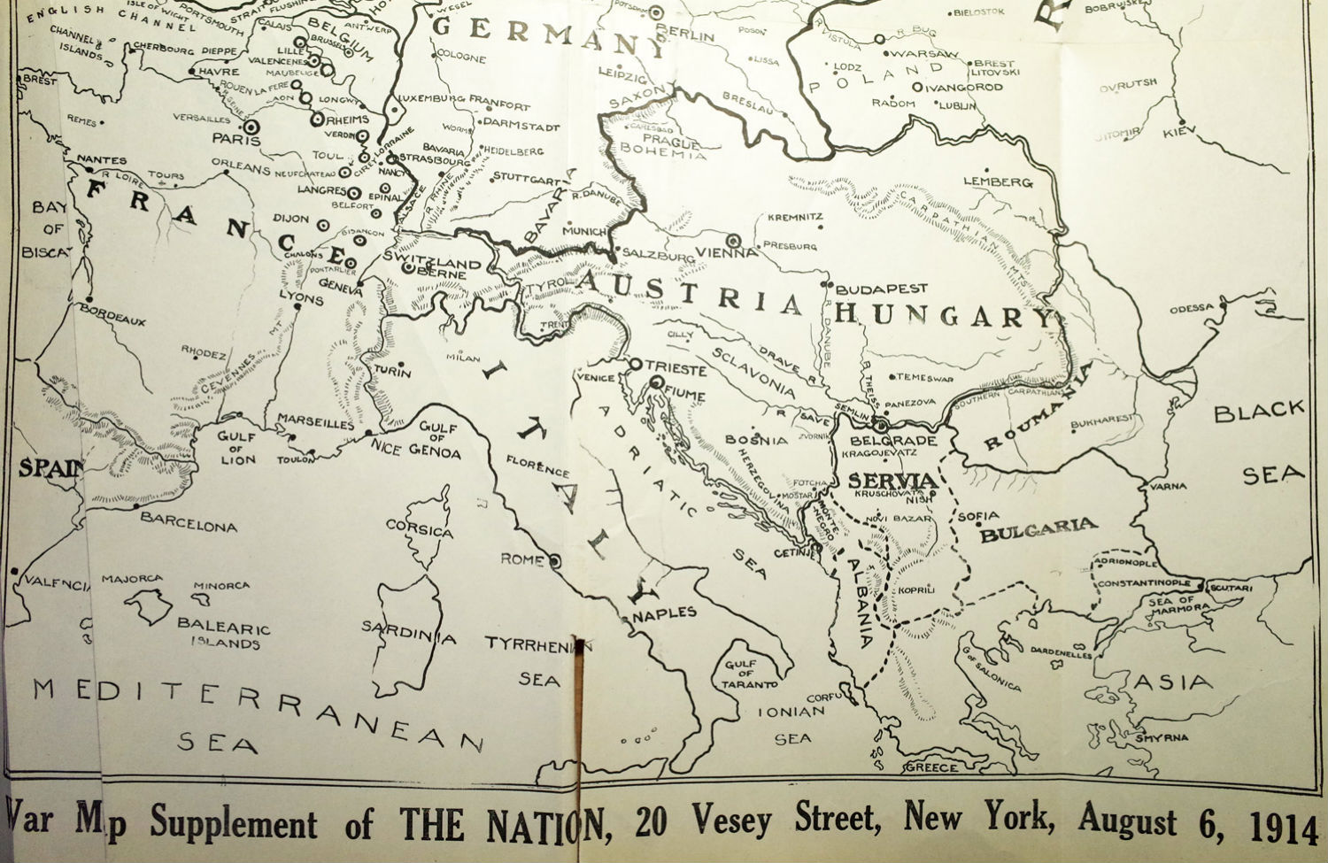 To read contemporaneous accounts of the beginning of World War I is to witness the disintegration of a world. The July 23 issue of The Nation doesn’t mention the European situation at all. The July 30 issue, apparently published just after the Austrian declaration of war against Serbia on July 28, observed that the entire continent seemed to be going mad all at once. Then a week later, Nation readers picking up the August 6 issue would have noticed a surprising bulge in the middle of the magazine: a massive four-page fold-out map of Europe in the first week of the Great War.