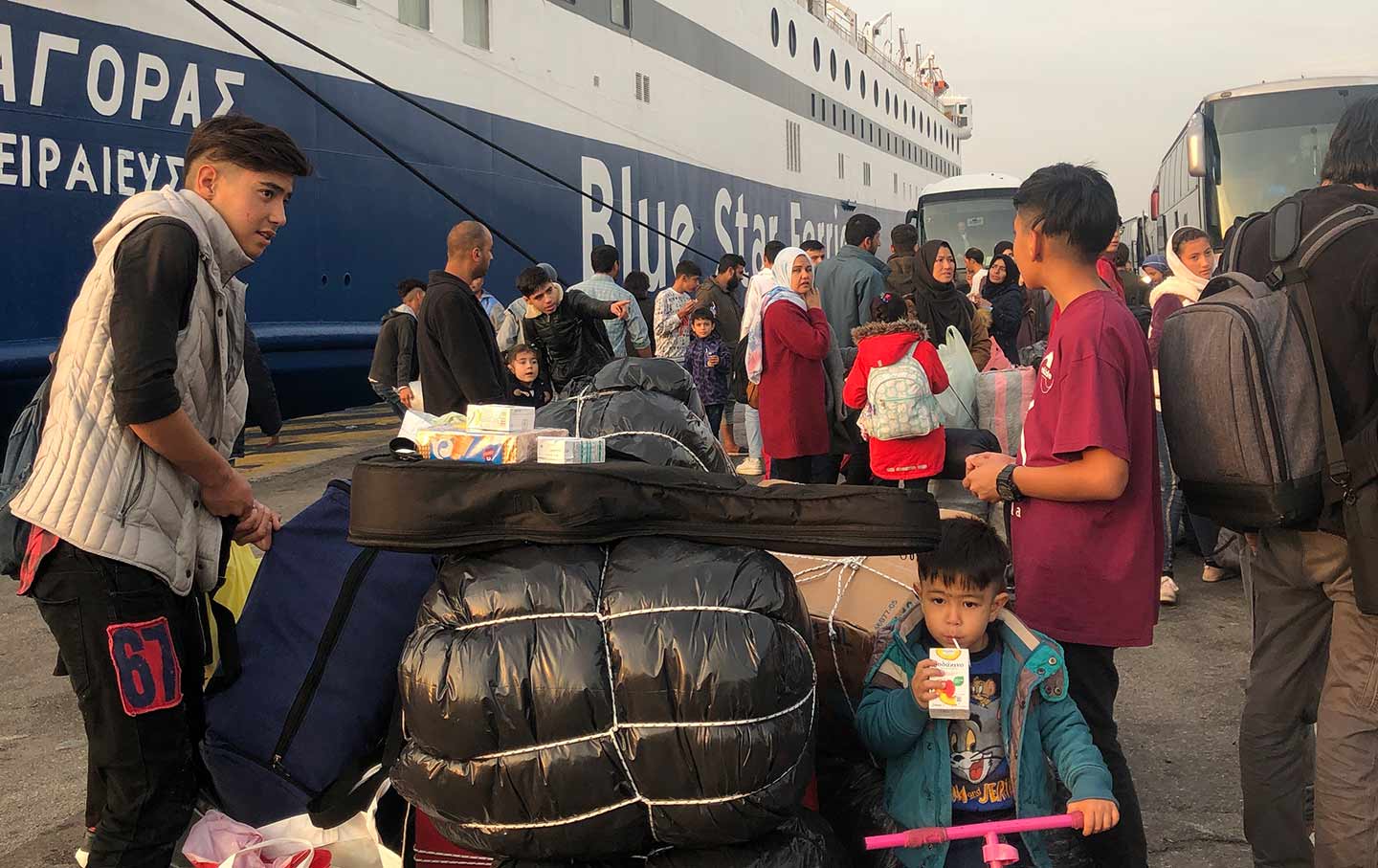 At 6:30 am on November 12, the Greek passenger ship Diagoras docked at Athens’s Piraeus port. As the sky slowly brightened to pink, cars, bikes, and pedestrians streamed haphazardly out along the ramp. The ship usually carries foreign tourists and Greeks traveling to and from the island of Lesbos. But among the passengers that day were 400 migrants from Afghanistan, Syria, and Iraq, who had until then been sequestered at Moria, Lesbos’s now-infamous migrant camp. Most of them had arrived on Greece’s shores in small boats from Turkey, where they had journeyed over land to escape conflict and poverty in their home countries. Now they were being relocated once again, to the Greek mainland—numbering among the 20,000 people that Greece’s government aims to transfer to new temporary housing by early 2020.
