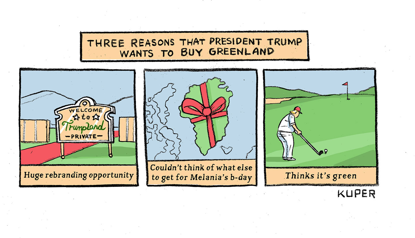PoliticsOppArtAugust 23, 2019Greenland Sees Red!Greenland Sees Red!Trump wants to buy Greenland—or else! Peter Kuper Share Copy Link Facebook X (Twitter) Bluesky Pocket Email August 23, 2019 Check out all installments in the OppArt series. Keep Reading Ad Policy