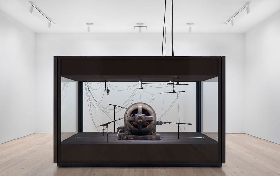 In contrast to the sculptures, where life itself might feel stuck, sound moves freely throughout Beasley’s audio work. Over the course of the exhibition, which was curated by Christopher Y. Lew, with assistance from Ambika Trasi, live performances by four artists punctuate Beasley’s use of sound: the musician and vocalist Taja Cheek, the percussionist and composer Eli Keszler, the electronic musician Jlin, and Beasley himself. Keszler held three consecutive performances at the end of January. The first show started late in the listening room, where people sat on the floor, absorbing the dizzying static of his sonic manipulation of Beasley’s cotton-gin motor under multicolored lights—Joni Mitchell blue, fire-truck red, Jolly Rancher green, Teletubbies purple. The performance itself is like a state of fugue: whirling din, full-body sensation, a pulse mediated by staccatos, shock waves, and static rain. And yet even with the din, there is a beat here, a gradual lull. Keszler’s sincerity of effort, the way he leans into his differing paces on his drum kit, gestures to how sound especially illuminates the fragmented history of our present moment that we would often rather ignore.