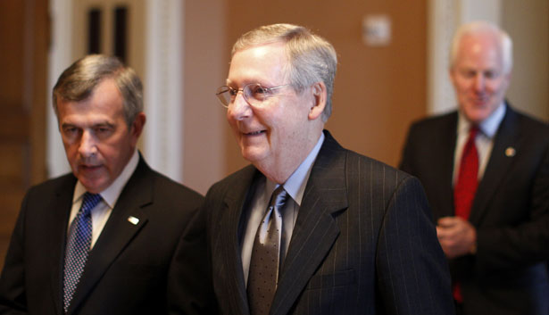 Senator Mitch McConnell with senators Mike Johanns, left, and John Cornyn, right. (AP Photo/Charles Dharapak.)