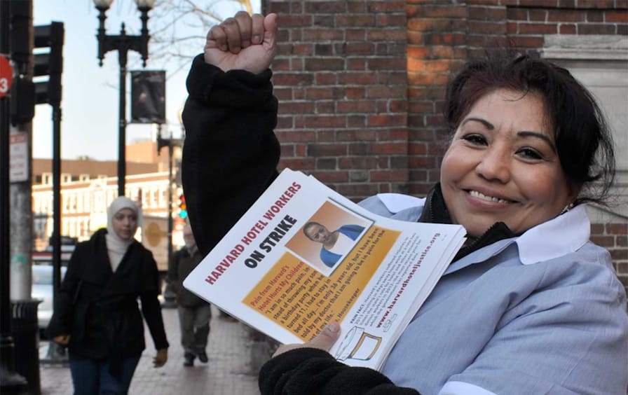 Nearly out of options, in November, the workers went on a one-day strike. It was the first hotel strike in Boston in 100 years. They woke up early. Some prayed together at an old Boston cathedral. The students strung signs across campus listing the workers’ complaints of injured backs and bad pregnancies. The workers cleared out their lockers the night before, in case they were fired. They went on strike all day, protesting outside, and refusing to work. But they weren’t fired. And they weren’t given a fair process. Nothing changed, and exhausted, they waited.