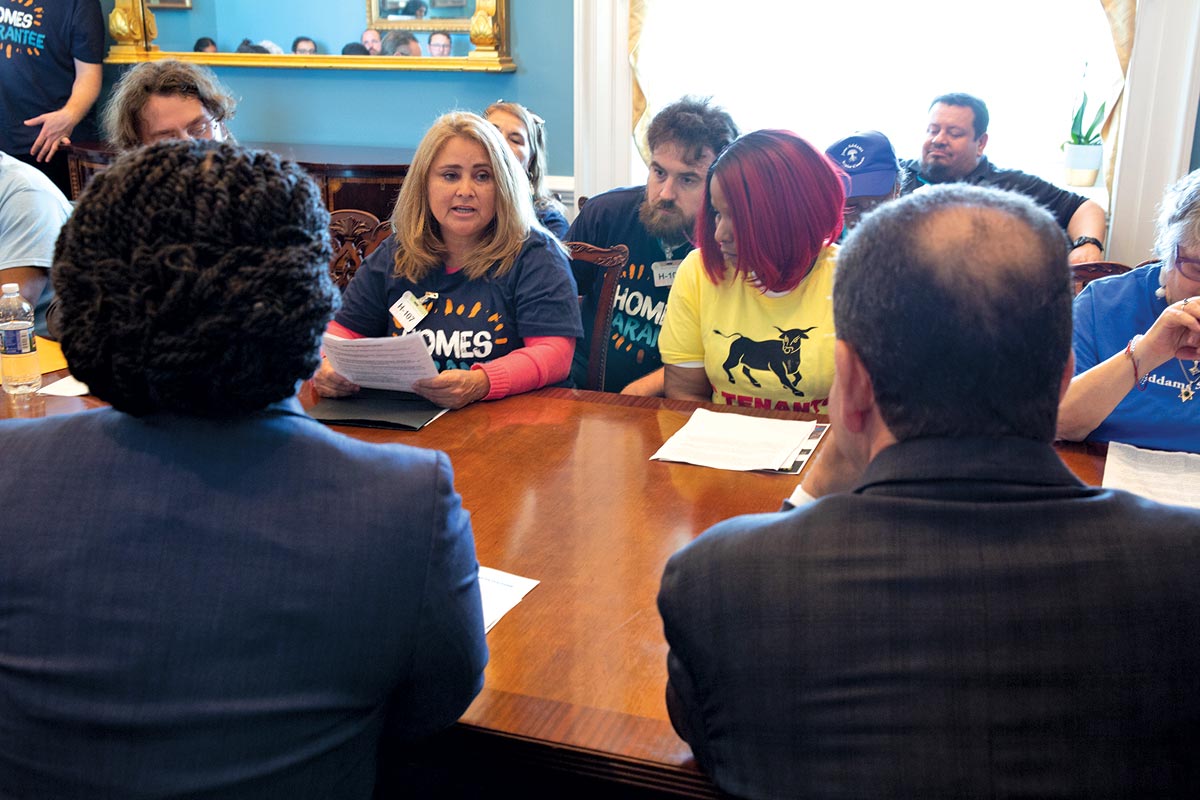 J, 49, is also frightened. A fellow San Fernando Gardens resident, she frets over her precarious economic position. Sitting in an elementary school classroom where a local chapter of the housing advocacy group People Organized for Westside Renewal (POWER) sometimes meets in the evenings to discuss policy issues, J says she left Sinaloa, Mexico, with her husband in 1998 because there was no work. In the United States she gave birth to three boys. For the past 12 years, the family has been living in a two-bedroom public housing apartment, for which they currently pay $706 in monthly rent.