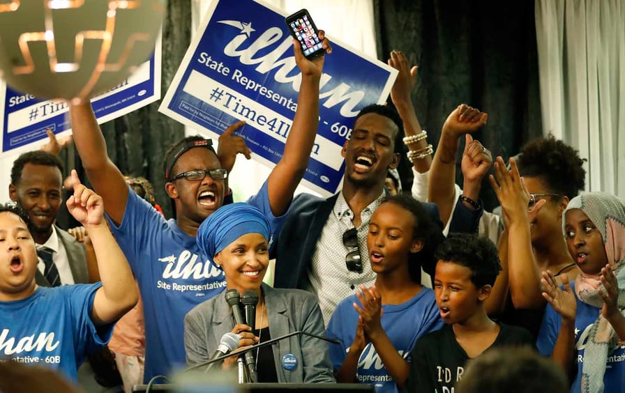 On a recent Sunday evening Ilhan Omar’s campaign held a party to celebrate her primary win in August and the lead-up to the general election. Held at an East African restaurant in the heart of Minneapolis’s diverse East Lake Street, in many ways the gathering felt like a typical East African family party. The banquet hall was decked out with white tablecloths and blue ribbons—the colors of the Somali flag. Somali men waited outside the door jawing and catching up with friends and relatives.2