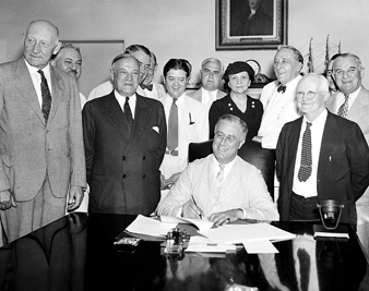 Roosevelt’s first hundred days were unprecedented in their scope and ambition. Barely settled in the White House, his administration stabilized the nation’s collapsed financial system. He repealed Prohibition–in an act that enhanced his popularity and stimulated at least one vital sector of the economy. Altogether he signed fifteen major pieces of legislation in just a little more than three months. Roosevelt created the Tennessee Valley Authority, a massive public works project meant to modernize the region’s economy. The newly minted Agricultural Adjustment Administration provided crop subsidies to farmers, regulating output and stabilizing prices in the deeply depressed agricultural sector (although privileging large farmers and seldom benefiting tenant farmers or farm laborers). His job-creation programs–the Federal Emergency Relief Administration and the Public Works Administration–dramatically reduced the ranks of the unemployed and stimulated the economy by building roads, libraries, post offices, hospitals and schools. And through the National Industrial Recovery Act–the most controversial and least effective of these first programs–the Roosevelt administration instituted central economic planning, promoting a novel collaboration between business and government.