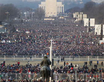 Three hours before Barack Hussein Obama took the oath of office to become the nation’s first African-American president, the crowd already looked impossible. Gazing west from the Capitol, you could see them: an incomprehensible mass of peaceful citizens, overwhelming every monument, impediment and security banner that had been put up to contain them. The sight was so arresting that when the senators marched out onto the rostrum, Patrick Leahy and Orrin Hatch stopped to snap photos.