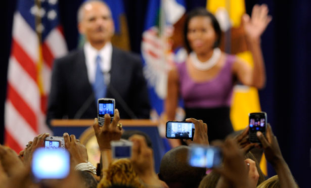 Attorney General Eric Holder (left) and Michelle Obama at the Justice Department, which has repeatedly put whistleblowers on the stand. (AP Photo/Susan Walsh)